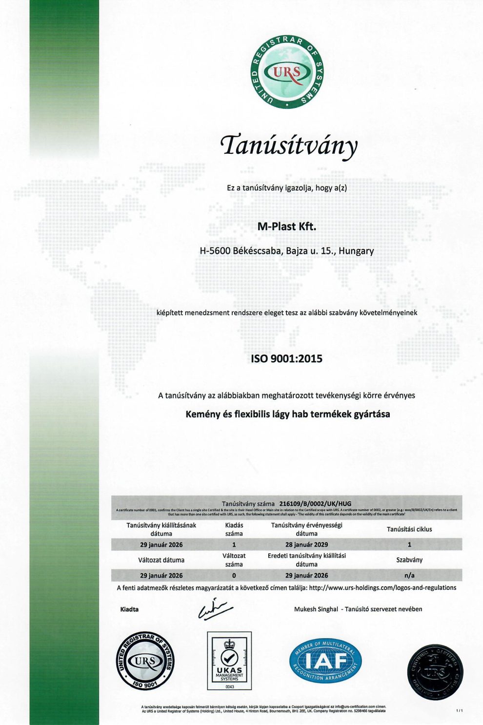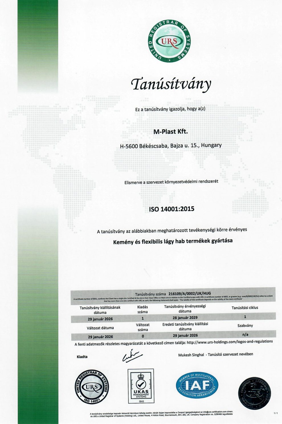 A tanúsítvány igazolja, hogy az M-Plast Kft., elismerve a szervezet minőségirányítási rendszerét, ISO 14001:2015 tanúsítvánnyal rendelkezik a Kemény és flexibilis lágy hab termékek gyártásának körében.